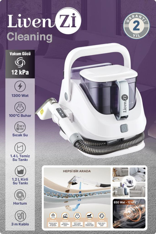 LivenZi JJB-747-A Buharlı Leke ve Halı Temizleyici, güçlü vakum, sıcak su ve yüksek sıcaklıkta buhar teknolojisini tek bir kompakt makinede birleştiren buharlı koltuk & halı temizleyici çözümüdür. Beyaz & mor tasarımıyla modern bir görünüm sunarken, evcil hayvan lekeleri, içecek dökülmeleri, zorlu kirler ve günlük kazalar için derinlemesine temizlik ve hijyen sağlar.