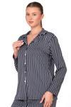 Önden düğmeli gömlek yaka üst ve düz paça pantolon formundaki alt parça, klasik çizgili deseniyle şık bir ev stili oluşturur.