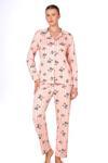 Önden düğmeli gömlek yaka üst ve rahat kesim düz paça alt, evde dinlenirken de uyurken de özgürce hareket etmenizi sağlar.