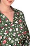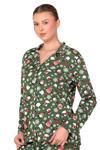 Yeşil zemin üzerine yerleştirilmiş kış temalı desenleriyle dikkat çeken bu pijama takımı, yumuşak dokulu kumaşı sayesinde serin akşamlarda sıcak ve konforlu bir kullanım sunar.