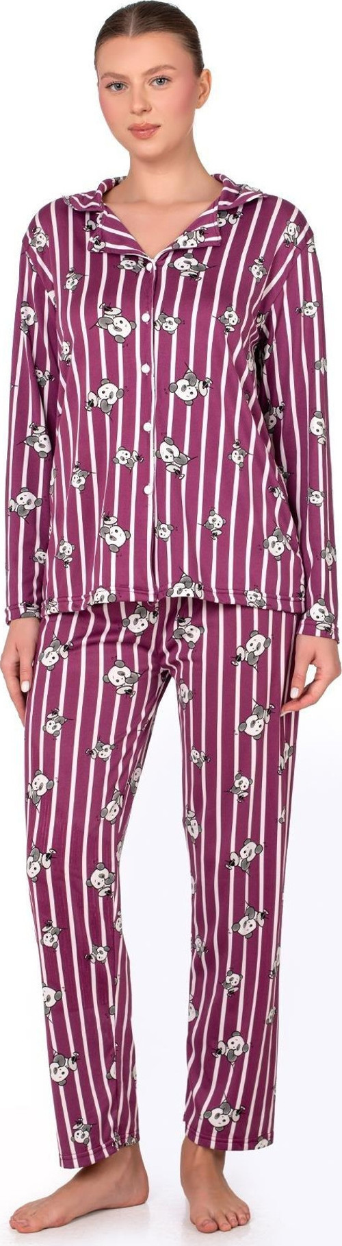 Mürdüm zemin üzerine çizgili ve panda desenli tasarımıyla öne çıkan bu pijama takımı, yumuşacık dokusuyla gün boyu ve gece boyunca rahatlık sunar.