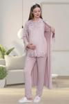 Lohusa Dünyası Kadın Pudra Dantelli Uzun Sabahlıklı Lohusa 3'Lü Pijama Takım Set