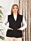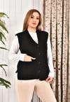 Kadın Düğmeli Siyah Renk Triko Anne Yeleği Büyük Beden Cepli Rahat Kesim Yelpaze Desen