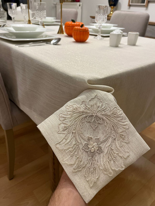 Zeren Home Lotus Dantel Detaylı Dertsiz Masa Örtüsü , El İşçiliği Fransız Dantel, Simli Gold