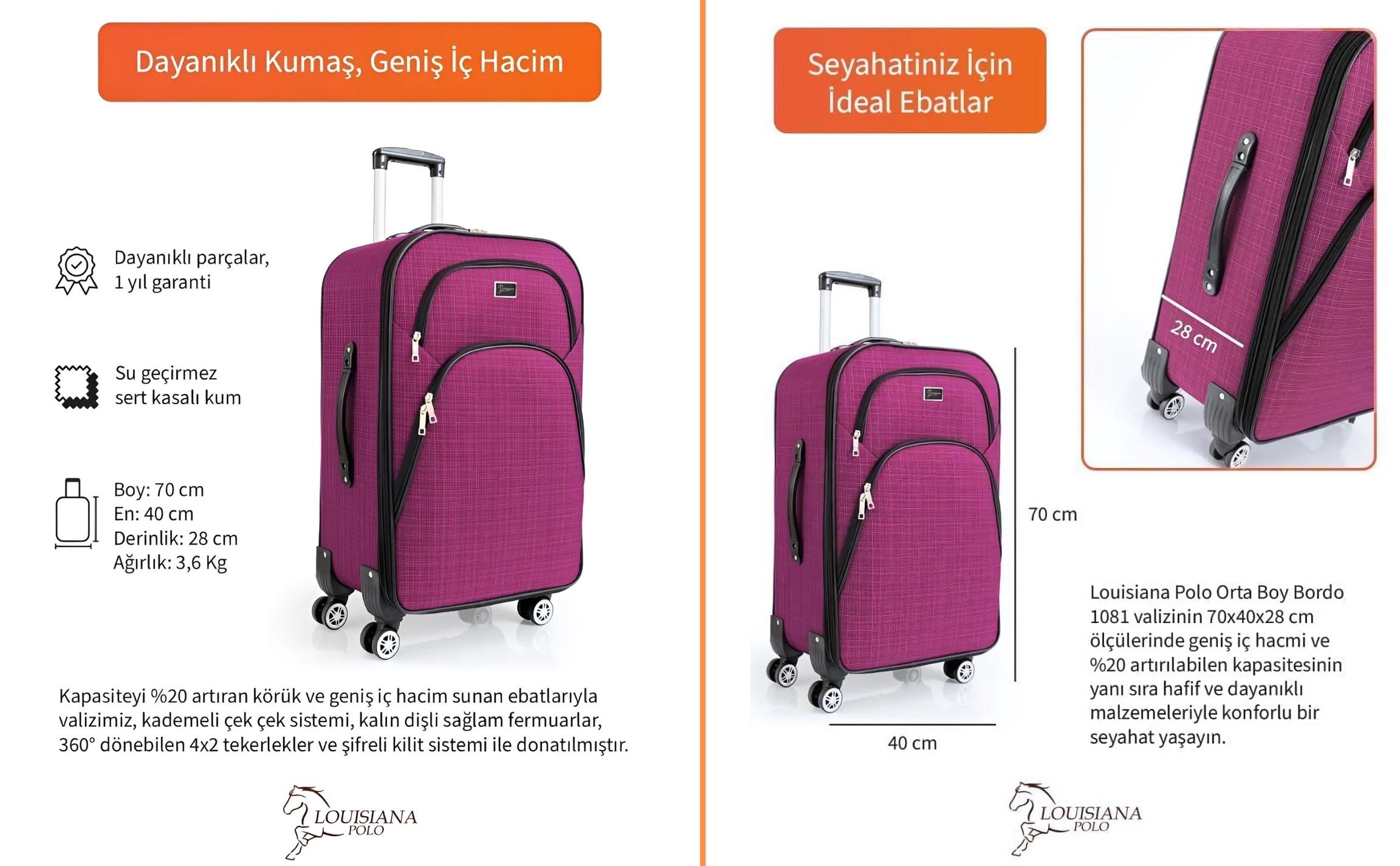 Louisiana Polo Valiz, zarif ve sade tasarımıyla dikkat çeker. Su geçirmez ve kolay temizlenen kumaşı, seyahatlerinizde pratik bir kullanım sunar. Kolay manevra kabiliyetine sahip tekerlekler ve rahat kavrama sunan çekme sapı, konforlu bir taşıma deneyimi sağlar. Hem iş hem de kişisel seyahatler için ideal bir bavul seçimidir.