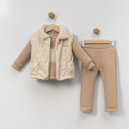 BASKILI PELUŞLU YELEKLİ ALT ÜST TAKIM - Bej - 9 Ay Bej