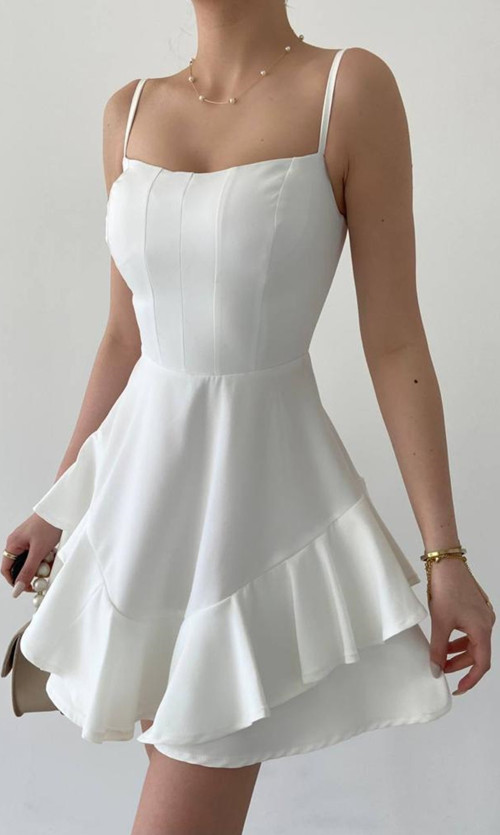 Lovebox Ayarlanabilir Ince Askılı Eteği Kat Detaylı Beyaz Abiye Elbise & Beyaz Mezuniyet Elbisesi 102