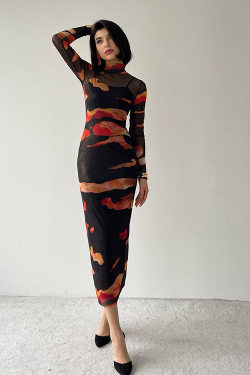 ÜRÜN KUMAŞ MATERYAL BİLGİSİ VE ÜRÜNLE İLGİLİ TÜM DETAYLI BİLGİLER ÜRÜN ÖZELLİKLERİ KISMINDA SEÇENEKLERDE BİLGİNİZE SUNULMUŞTUR - Batik desenleriyle süslenmiş, tasarım dik yaka midi elbise, her yaş grubuna hitap eden şık ve modern bir görünüm sunar..