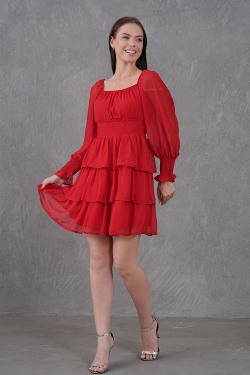- - Zarif tasarımıyla dikkat çeken bu şifon elbise, mavi tonlarında eteği kat detaylarıyla göz alıcı bir görünüm sunar..