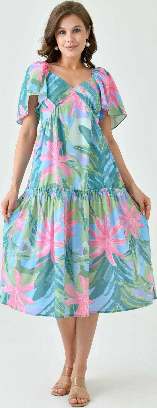 - Tropikal çiçek desenleriyle süslenmiş, midi boy kloş kesimi sayesinde rahat hareket etme özgürlüğü sunar.