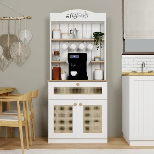 Lucas 2 Kapaklı Çekmeceli Pvc Sarı Hasır Desen Kahve Köşesi & Çok Amaçlı Mutfak Dolabı-Açık Ceviz & Beyaz