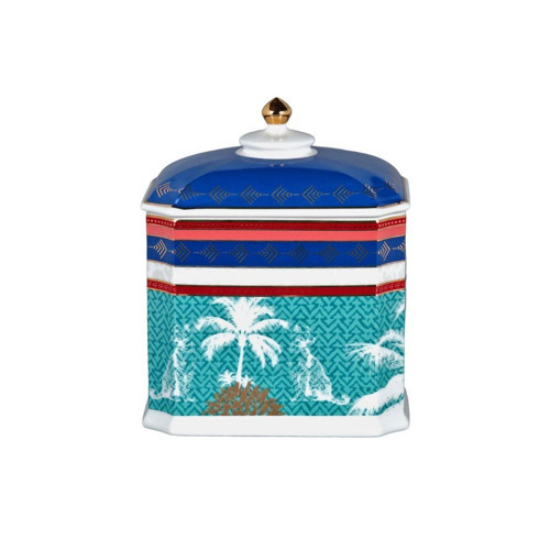 Palmera Bone koleksiyonunun bu köşeli formuyla ayrışan parçası, mutfak düzeninize hem modern bir dokunuş hem de egzotik bir soluk getirmek için tasarlanmıştır. Turkuaz zemin üzerindeki palmiye desenleri ve lacivert-kırmızı şerit detaylarıyla zenginleştirilen bu kavanoz, tezgah üstü dekorasyonunuzun en asil üyelerinden biri olmaya adaydır.