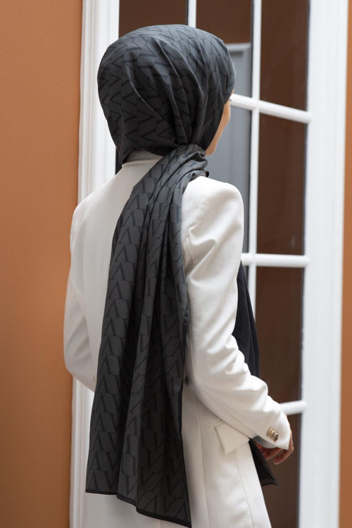 LÜKS MEDİNE İPEĞİ DEGRADELİ MONOGRAM DESENLİ GRİ RENKLİ 75X195 KIRIŞMAZ ŞAL MOSS KREP DİKİŞ TİPİ İTALYAN DİKİŞLİ