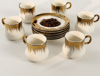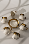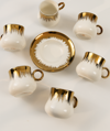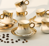 Zarif beyaz porselen üzerine gold detaylarla tasarlanan bu set, hem günlük şıklık hem de özel davetler için idealdir. Türk kahvesi ölçüsündedir; espresso servisinde de kullanılabilir.