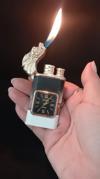 Bu özel tasarım çakmak, lüks altın rengi ejderha başı figürü ve Roma rakamlı entegre kuvars saati ile dikkatleri üzerinize çekecek.