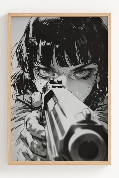 Çerçeveli Siyah Beyaz Anime Kadın Silahı Poster - Modern Duvar Dekoru