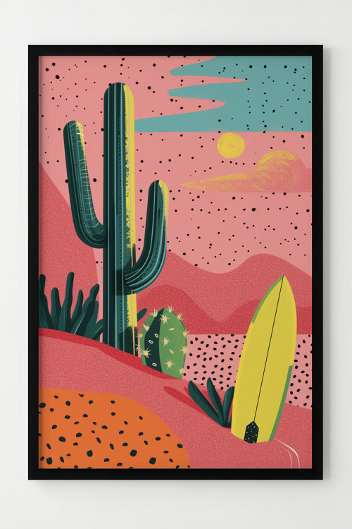 Renkli Kaktüs ve Surf Tahtası Temalı Çerçeveli Modern Dekoratif Poster