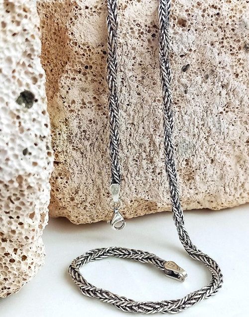 925 ayar gümüşten üretilmiş olan bu zincir, örgü desenli burgu tilki kuyruğu tasarımıyla dikkat çeker.
