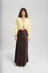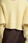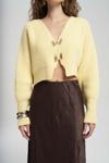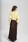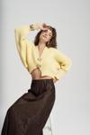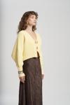 Oversize formda, uzun kollu, ön kapaması metal klips detaylı, etek ucu ve kol ağzı lastik örgülü crop triko hırka.