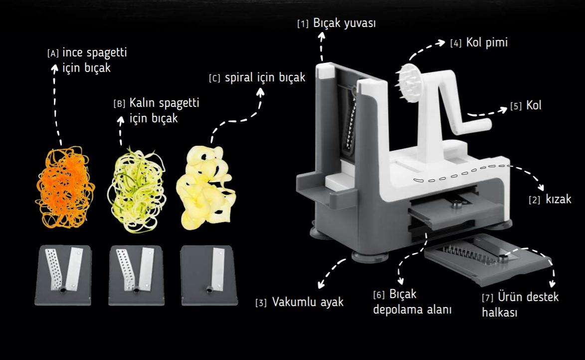 Spiral Sebze Doğrayıcı üç farklı bıçak düzeneğine sahiptir. Keskin paslanmaz çelik bıçaklar gıdalarınızı kolay bir şekilde doğrayacaktır.