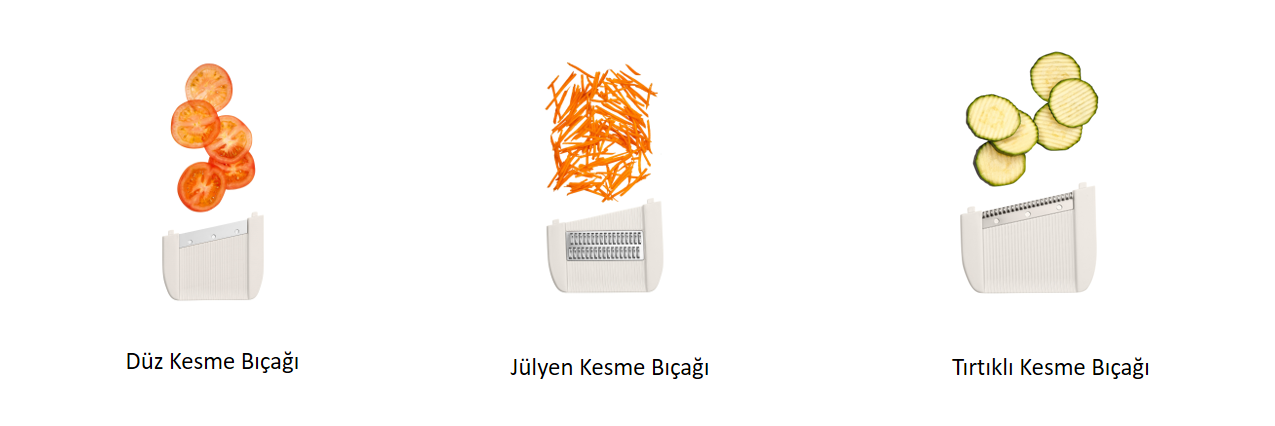 Sağlıklı bir atıştırma istediğinizde tırtıklı kesme bıçağı ile pancar, patates, yaban havucu, elma cipsleri hazırlayabilirsiniz. Düz kesme bıçağı ile sebze ve meyveleri istediğiniz incelikte dilimleyebilir, jülyen kesme bıçağı ile jülyen şeritleri kolaylıkla elde edebilirsiniz. Hem sofranızı süsler hem de tüm işlemlerde besin ve vitaminleri de tamamen korursunuz.