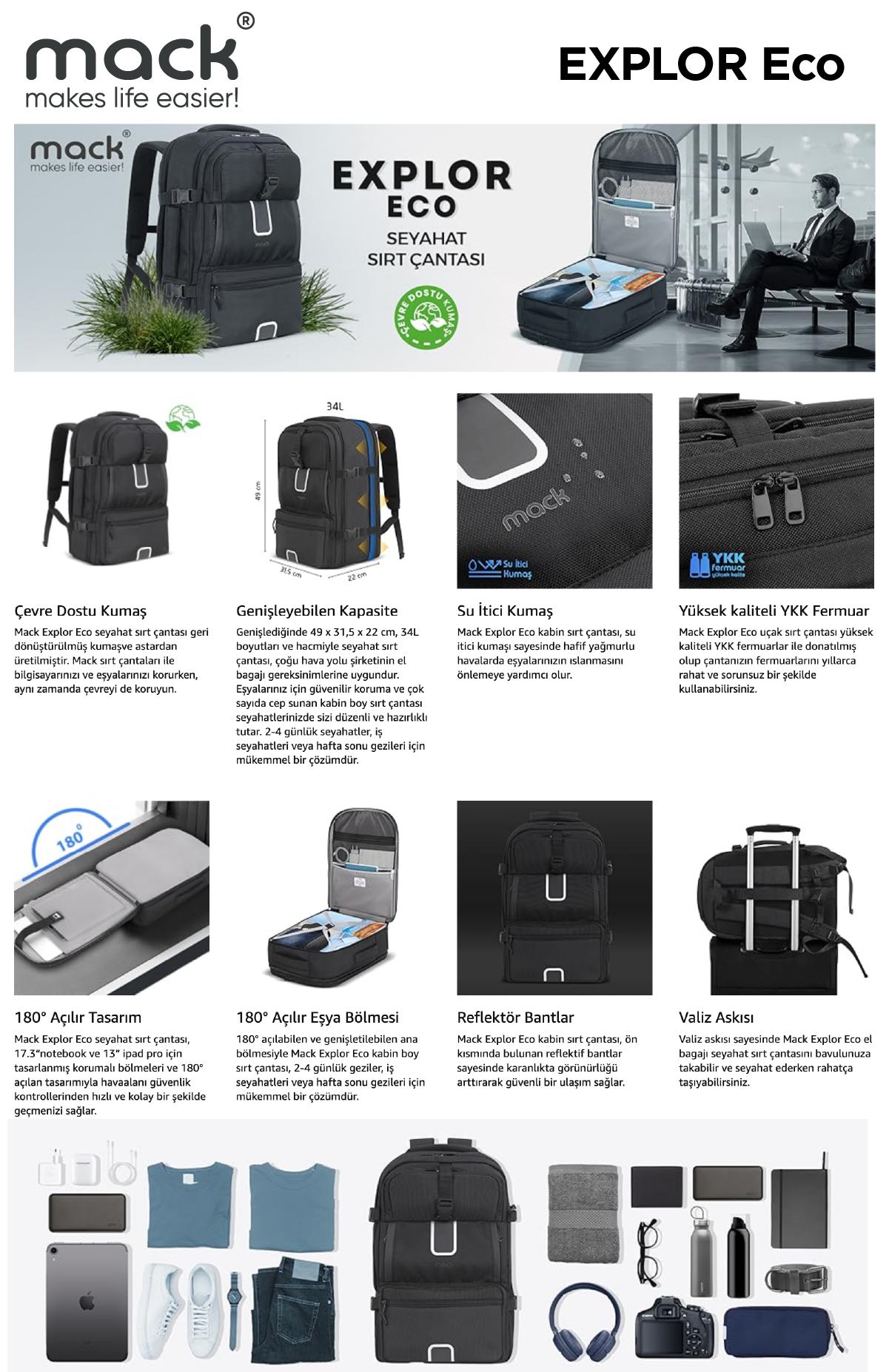 Mack Mce-1205 17.3 Explor 34L Eco Seyahat Sırt Çantası 8682998401308 Günlük kullanım için ideal, casual tarzıyla dikkat çeken Mce 1205 sırt çantası, şıklığı ve rahatlığı bir arada sunar Sade ve düz deseniyle her türlü kıyafetle kolayca uyum sağlar, zamansız bir aksesuar oluşturur Dayanıklı tekstil materyali sayesinde uzun süreli kullanım için idealdir günlük aktivitelerinizde yanınızda Geniş iç hacmiyle büyük boy tasarımı, tüm eşyalarınızı rahatça sığdırmanızı sağlar Fermuarlı kapama şekli ile eşyalarınızın güvenliğini artırırken, hızlı erişim imkanı sunar Suya dayanıklı kumaş teknolojisi sayesinde yağmurlu havalarda bile eşyalarınız kuru kalır