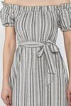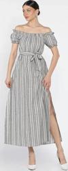 Madonna yaka midi yırtmaçlı kuşaklı keten elbise, gardırobunuzun şıklığını tamamlayacak bir parçadır.