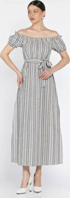Madonna yaka midi yırtmaçlı kuşaklı keten elbise, gardırobunuzun şıklığını tamamlayacak bir parçadır.