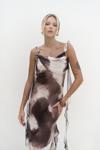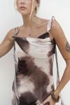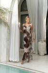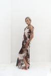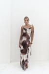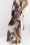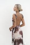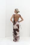 Kare yaka, omuzları fırfır bağlama detaylı uzun desenli elbise. Derin yırtmaçlı ve fırfır ile detaylandırılmış yan şeritli. Astarsız.