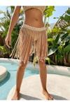 Major Butik Kadın Bej İncili Püsküllü Tığ Örgü Deniz Kabuklu Tasarım Pareo
