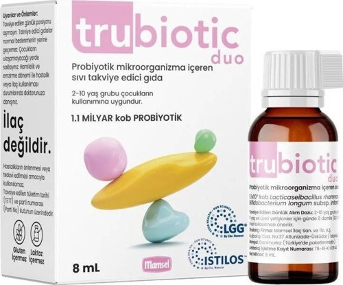 Trubiotic Duo, her 6 damlada 1 milyar kob Lactobacillus rhamnosus GG DSM 33156 (LGG®) ve 100 milyon kob Bifidobacterium longum subsp. infantis DSM 33361 (ISTILOS™) içerir.