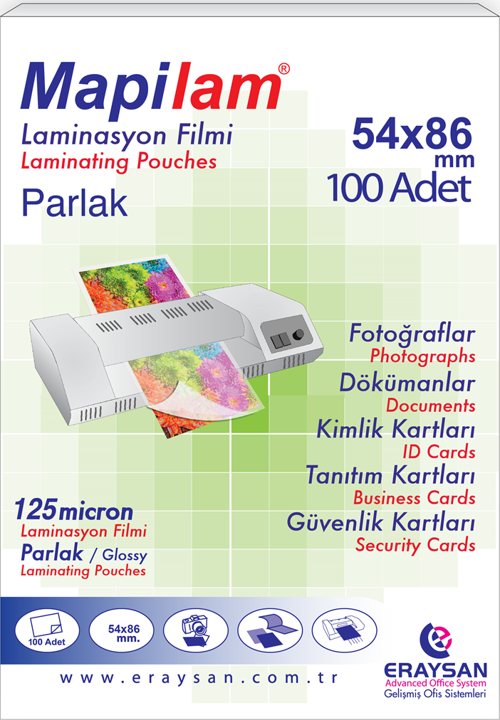 Mapilam 125Mic.54X86 Parl.Polyester. 100 Ad. Laminasyon Filmi Mapilam 125 mic. Kredi Kartı Parlak Laminasyon Filmi, Ebadı : 54 x 86 mm Görünüm : Parlak Kalınlık : 125 mic. Pakette : 100 ad.