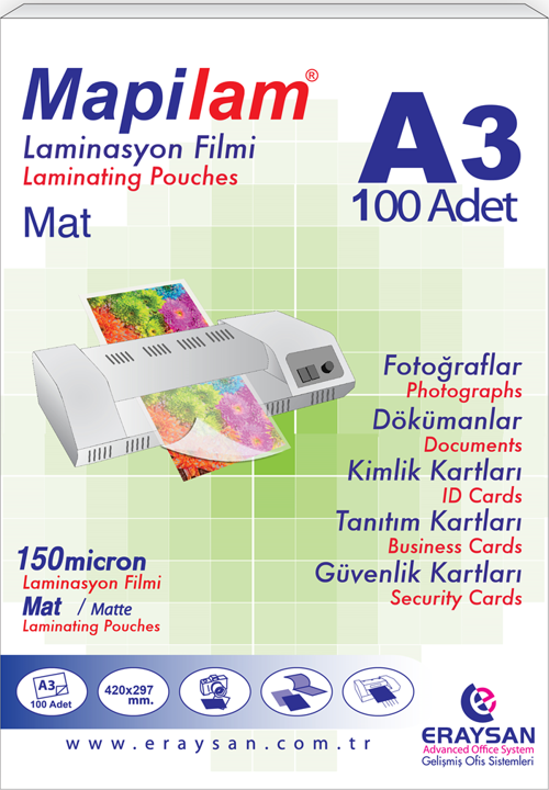 Mapilam 150Mic.A-3 Mat Polyester 100 Ad. Laminasyon Filmi Mapilam 150 mic. Mat Laminasyon Filmi, Ebadı : A3 (426 x 303 mm) Görünüm : Mat Kalınlık : 150 mic. Pakette : 100 ad.