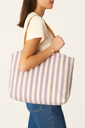 Çizgili Kanvas Kadın El Omuz Çantası Fermuarlı İçi Cepli Canta