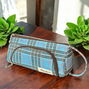 Ilgaz Mavi Ekoseli Büyük Geniş Organik Kanvas Pamuk Bez Kumaş Kalem Kutusu Kalemlik Makyaj Çanta