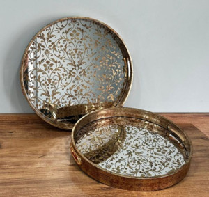 BELİZA 2’li Ahşap Kenarlı Eskitme Cam Tepsi Seti (34–39 cm)