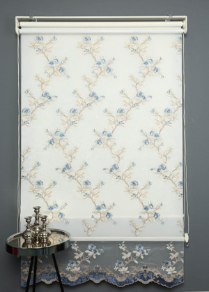 Mavi Çift Mekanizmalı Kadife Sarmaşık Nakışlı Tül Stor Perde (Dayanıklı Alüminyum Kasa)