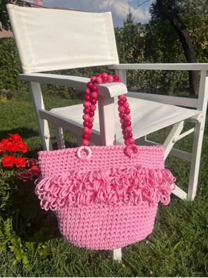 Pembe Penye İp El Yapımı Çanta, Tahta Boncuk Askı, Gül Desenli Astar