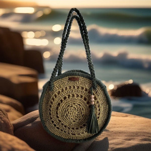 Yeşil Yuvarlak El Yapımı Astarlı Tahta Boncuk Ve Püskül Detaylı Mini El Çantası