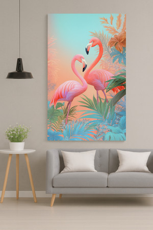 BLT DİZAYN Tropikal Flamingo Desenli Çerçevesiz Cam Tablo – Modern Salon ve Ofis Dekorasyonu