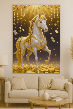 BLT DİZAYN Altın Bereket Atı Cam Tablo – Zenginlik ve Şans Sembolü Çerçevesiz Dekor