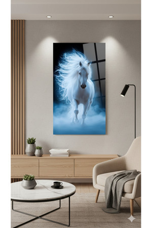 BLT DİZAYN Güç ve Özgürlük Temalı Beyaz At Cam Tablo – Premium Kalite