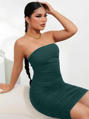 Bss Yeşil Mini Straplez Büzgülü Abiye Elbise Düğün, Nişan Ve Mezuniyet Için Tam Astarlı Tasarım
