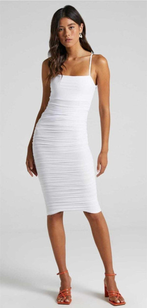 Kadın Beyaz Darapeli Büzgülü Askılı Midi Elbise