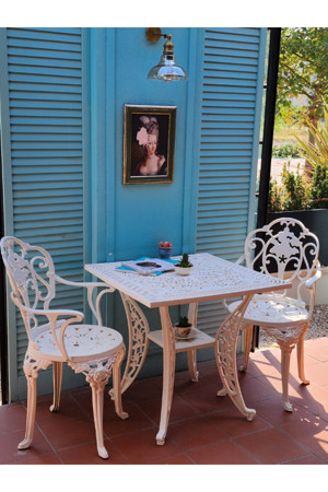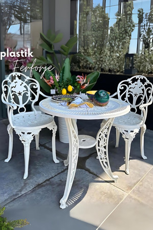 Ferforje Görünümlü Masa Sandalye, Dış Mekanda Kullanılabilir 3 Kişilik Plastik Beyaz Masa Takımı