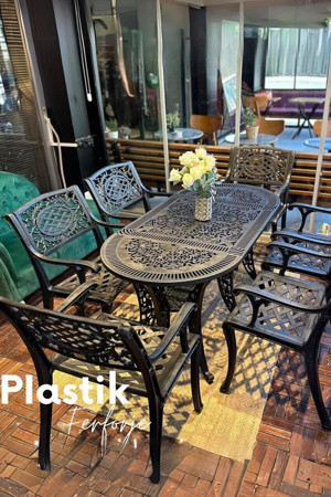 Ferforje Görünümlü Masa Sandalye, Dış Mekanda Kullanılabilir, 6 Kişilik Plastik Siyah Masa Takımı