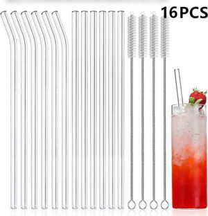 14Pcs/Set Reusable Glass Straws Clear Smooth Glass Drinking Straw 6 Straight And 6 Bent With 2 Cl...