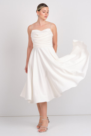 Kadın Taşlı İp Askılı Drapeli Saten Abiye Elbise 1749 Ekru