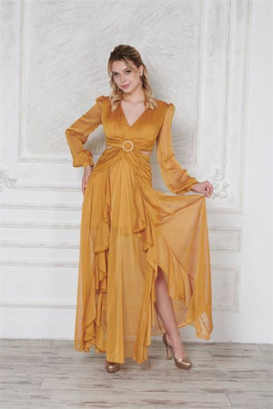 kadın gold v yaka simli tül abiye elbise DPS9223