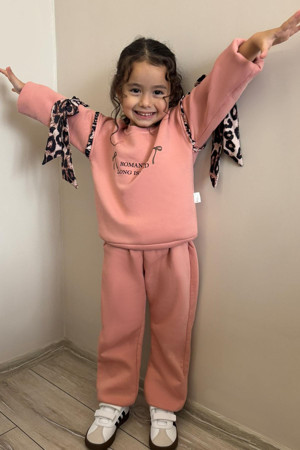 Kız Çocuk Eşofman Takımı Kolları Leopar Fiyonk Aksesuarlı Yazı Baskılı 2-5 Yaş, Gülkurusu